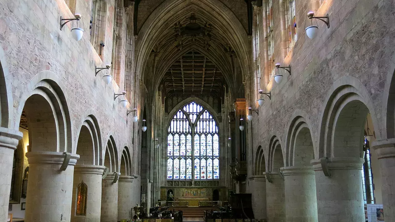 A photo of the interior of Totnes St Mary church looking at the stained glass window and altar and with arches to the side