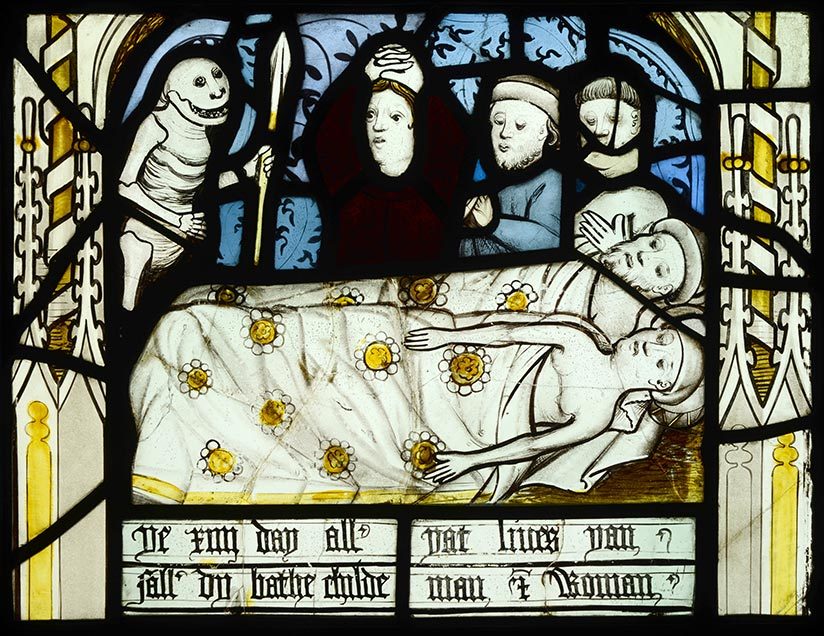 The other, dating from 1410, is the Pricke of Conscience window, an apocalyptic vision of Doom, the last 15 days of the world. Based on a popular contemporary poem, it shows rising seas and monsters, the earth on fire, men hiding in hole and the dreadful spectacle of a couple lying on a bed with a spear wielding, skeletal figure of Death standing beside them as horrified figures look on. It is a distressing scene of medieval guilt and the fear of everlasting punishment.