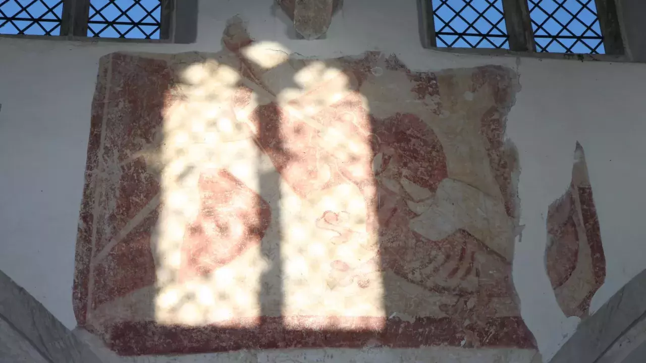The characterful interior boasts box pews for the gentry either side of the central benches for socially lesser worshippers. Memorably are the fragments of medieval glass restored and set into a south window. Elsewhere is 1850s glass made in the workshop at Costessey. There are partial wall paintings of St Christopher and St George slaying a dragon. Both of these wall paintings have lost their top third due installation of a clerestory long before desecrations of the Reformaiion.