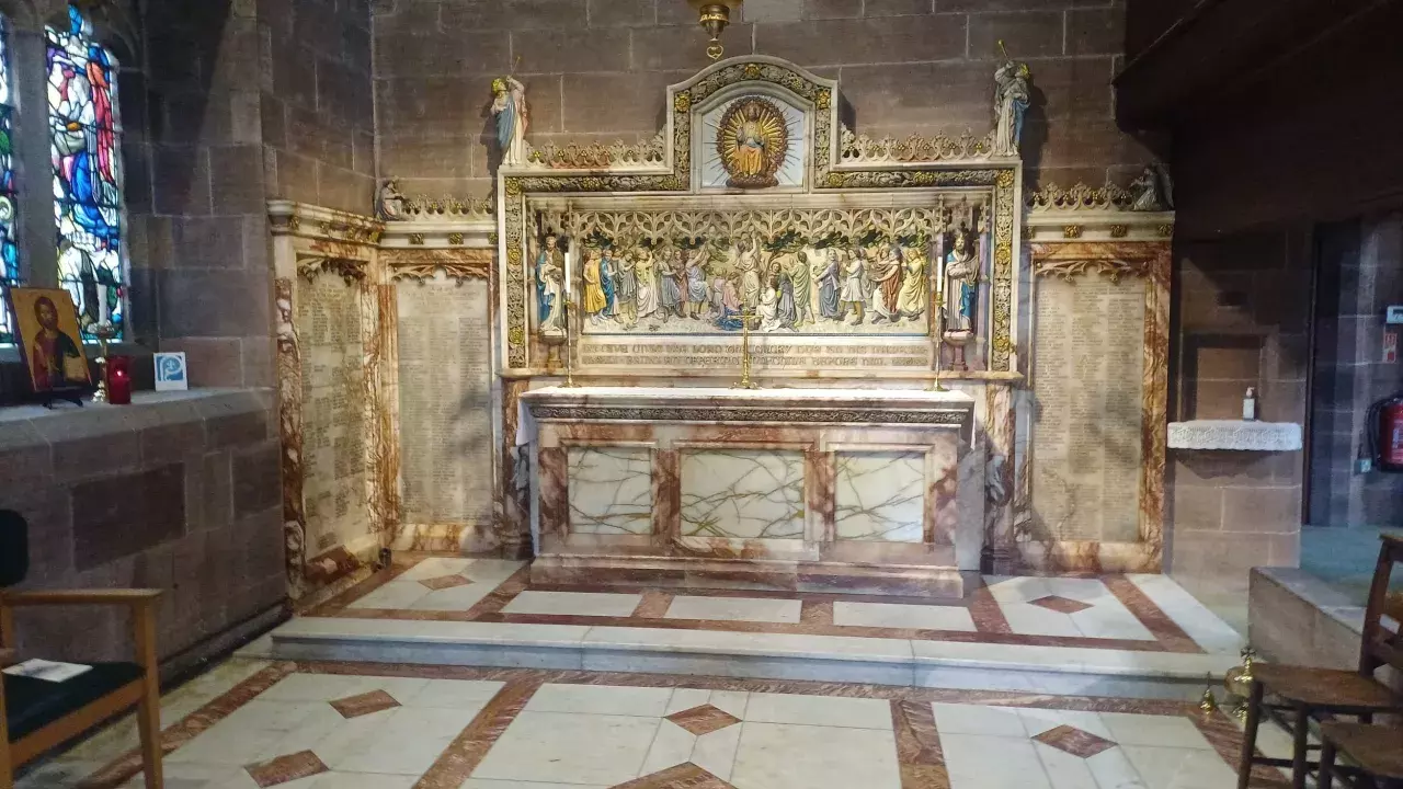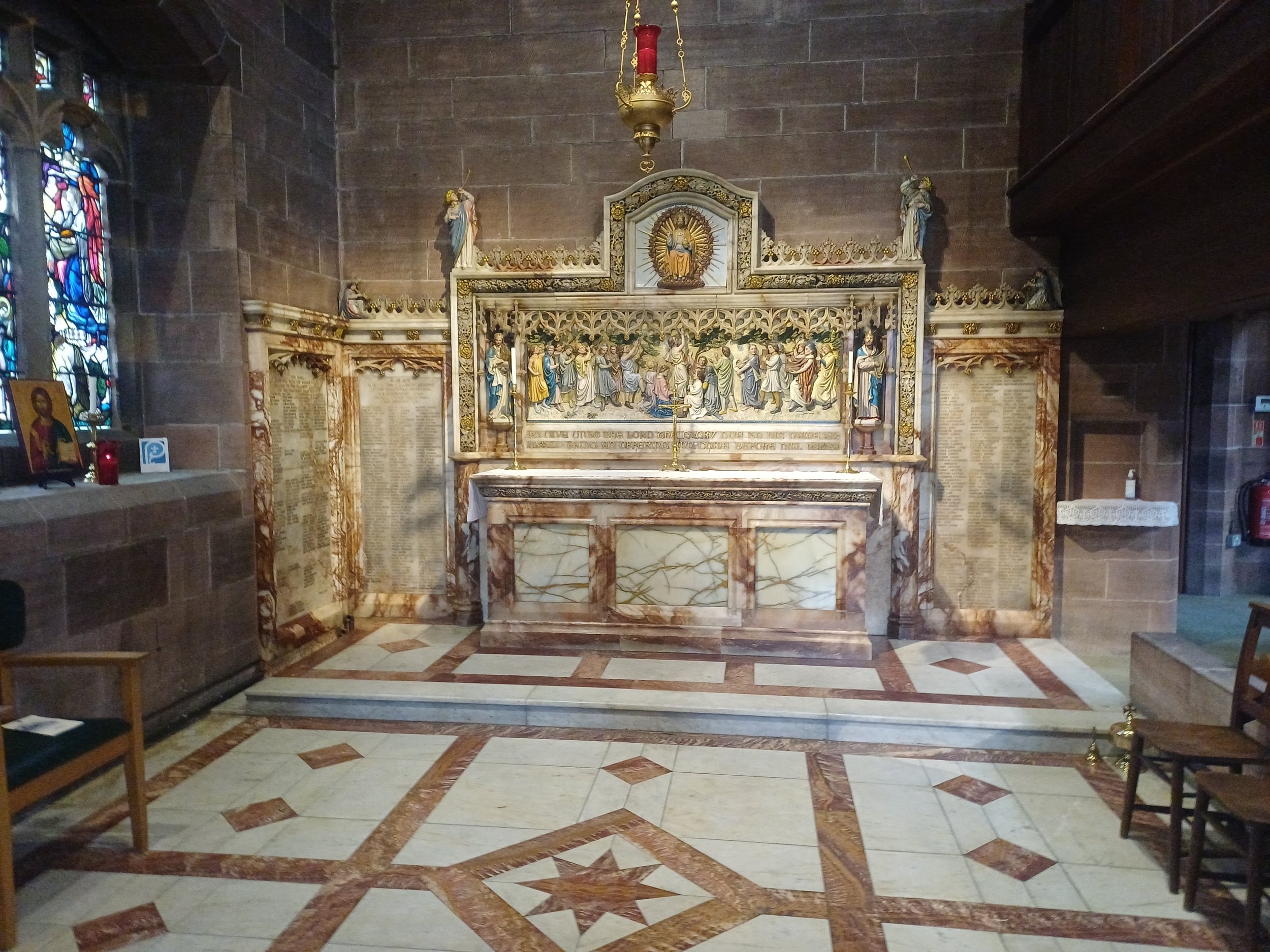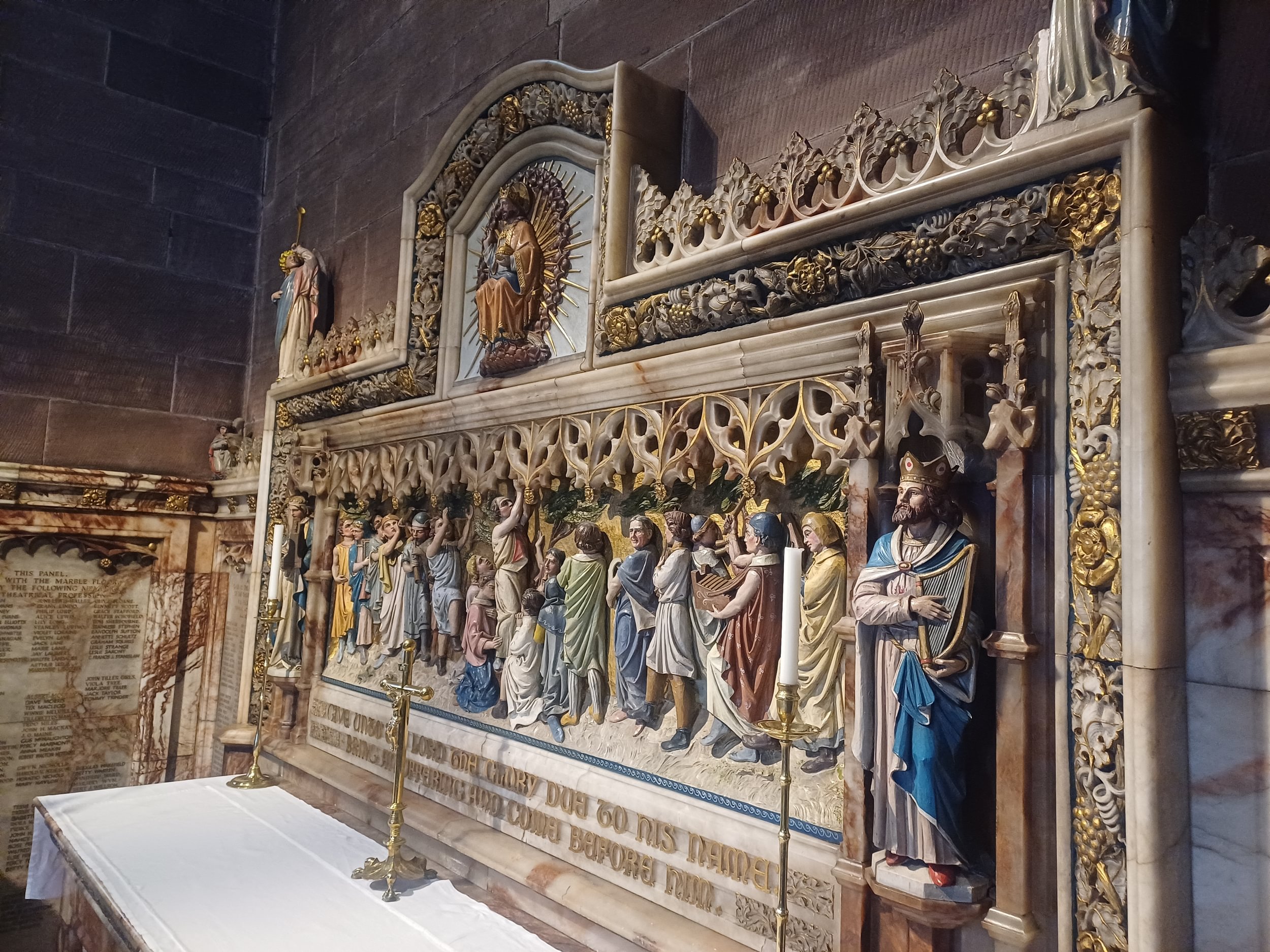 St Stephen's connection with Blackpool's entertainment world was strengthened when actors and artists subscribed to create the Actors Chapel in 1928. The chapel features a reredos with a double procession of carved singers, dancers and musicians above the marble altar. The side panels bear the names of theatrical benefactors, and many famous names can be seen, such as Noel Coward, George Formby, Arthur Askey and Ivor Novello. The additional panel, which bears the names of donors who were members of the theatrical profession, was unveiled by Gracie Fields in May 1929.
