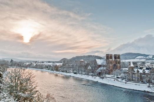 An imposing building constructed in pink sandstone which stands close to the west bank of the River Ness and looks across the river to the city centre and to Inverness Castle.