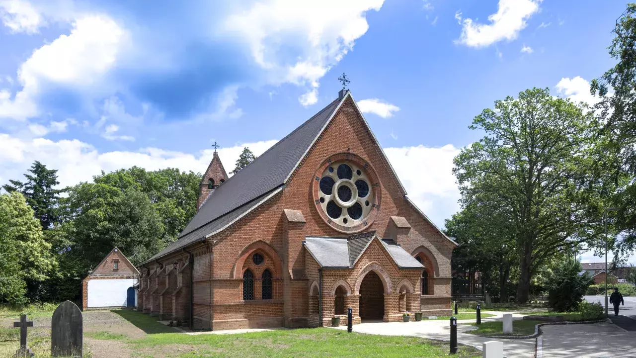 Long and red brick with Portland stone facings and with a tall tower topped by a spire, the church is a prominent local landmark.