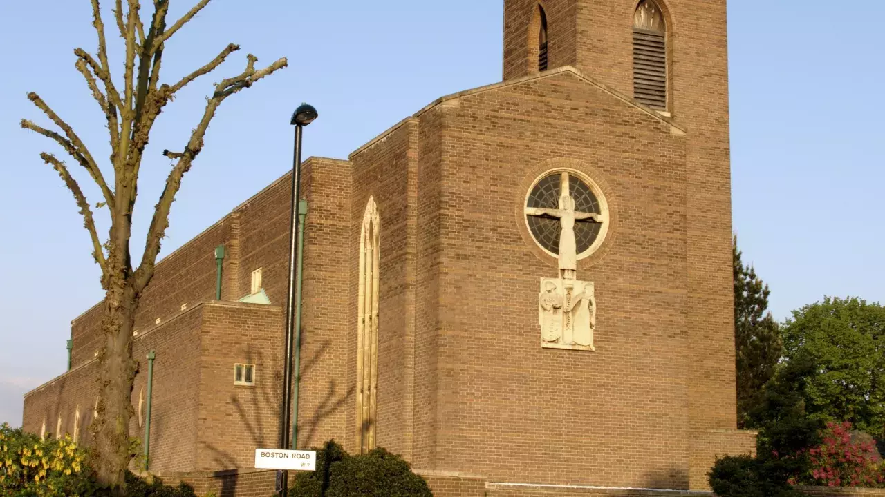 The building is on a northeast axis with a tall, square northeast bell tower. The exterior of the building has simple lines and is constructed of subtly banded, reddish brown bricks. Carved in situ from a single block of limestone, the Calvary by Eric Gill is on the northeast face and incorporates the east window. A carved keystone in the arch of the main entrance is the work of Vernon Hill.