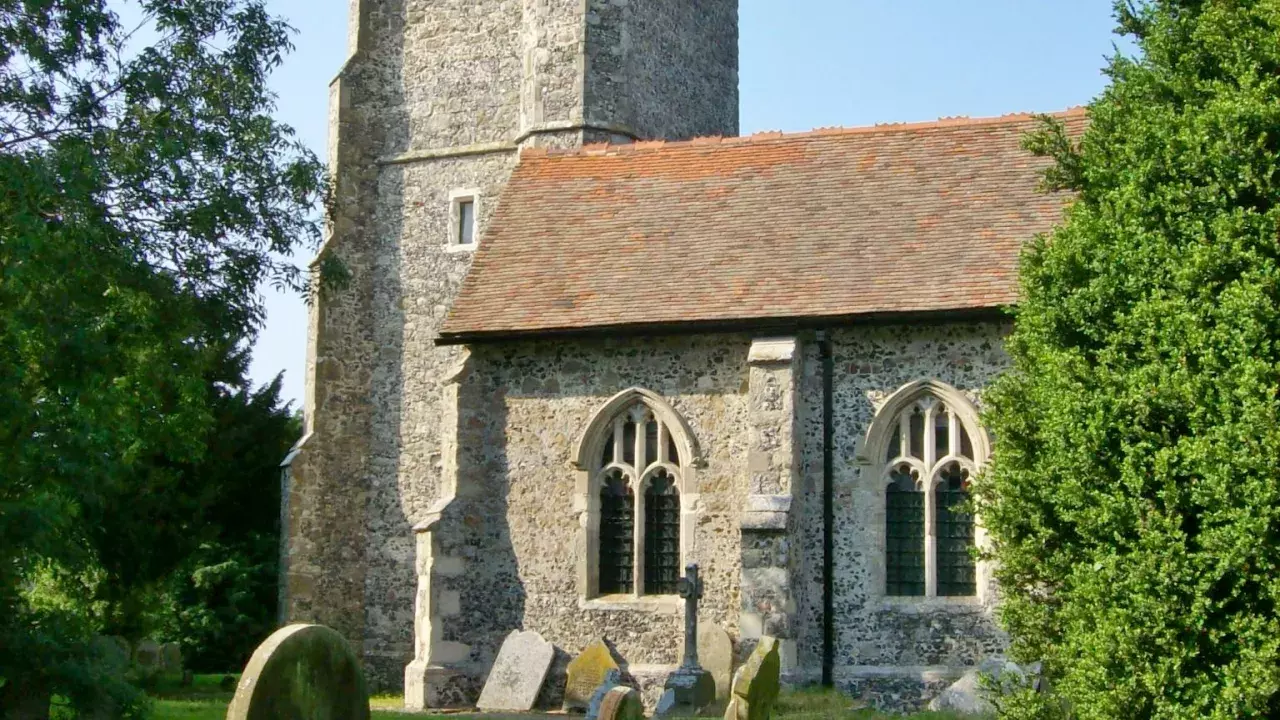 Most of the current building is 15th century, built in the distinctively English perpendicular style with graceful, slender columns and four centred arches of Bethersden Marble separating the nave from the aisles. The church is one of the few in Kent which is still wholly in the perpendicular style. Parts of the earlier church remain in the south aisle where marks left by the 12th century masons are etched into the wall. The Martyn family, local lord of the manor, was responsible for the 15th century building. To celebrate the completion, they installed a memorial window, fragments of which can still be seen in the south window of the chancel. This 15th century glass survived because it was hidden from Cromwell in a local barn. It was probably first installed during the reign of Edward IV as it contains the image of the sun in splendour, his heraldic badge, and the white roses of York.