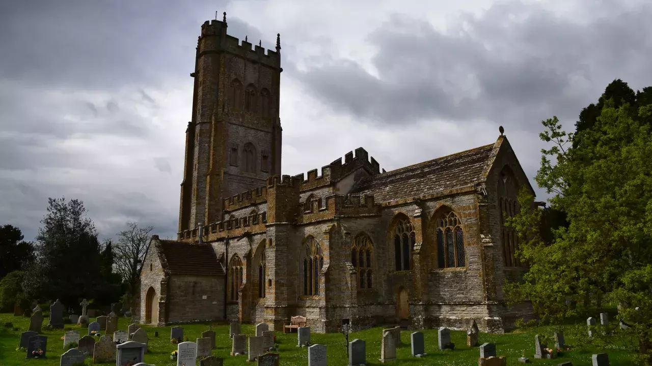 15th century church with tie beam roof. The tower is 96ft tall, and has'Somerset' tracery to let out the sound of the six bells. The wooden carved angels on the interior roof king posts are only found rarely in churches. The magnificent carved and painted pulpit is older than the church. It has statues of the twelve apostles in its niches.