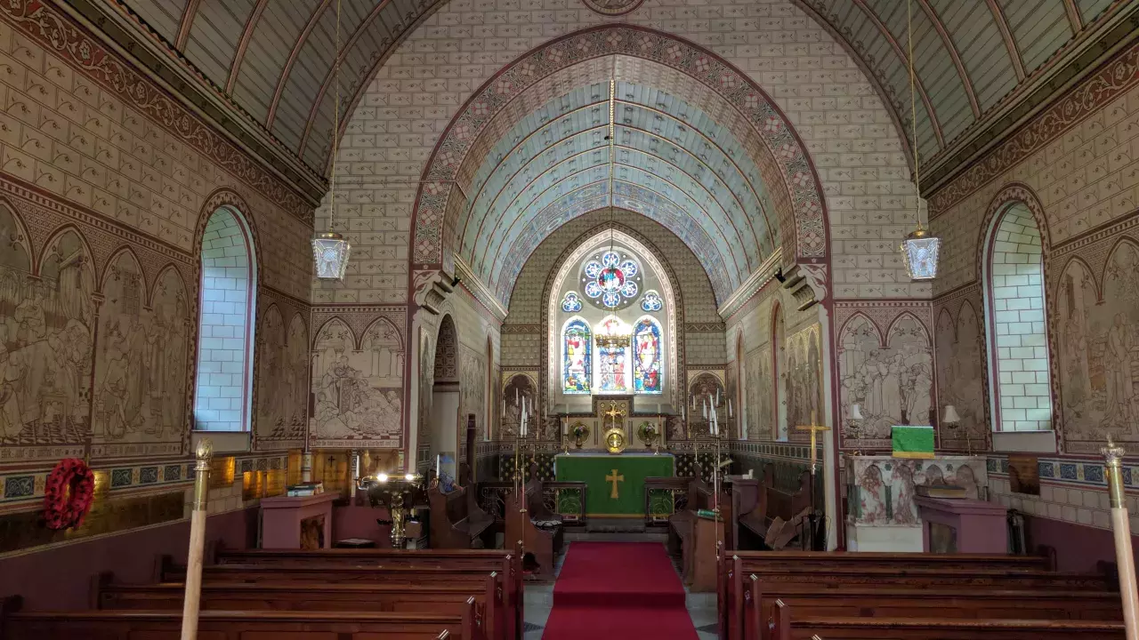 Built in 1865 of local sandstone with a Gothic style bell tower, excellent stained glass windows and a series of 25 frescoes decorating the interior.