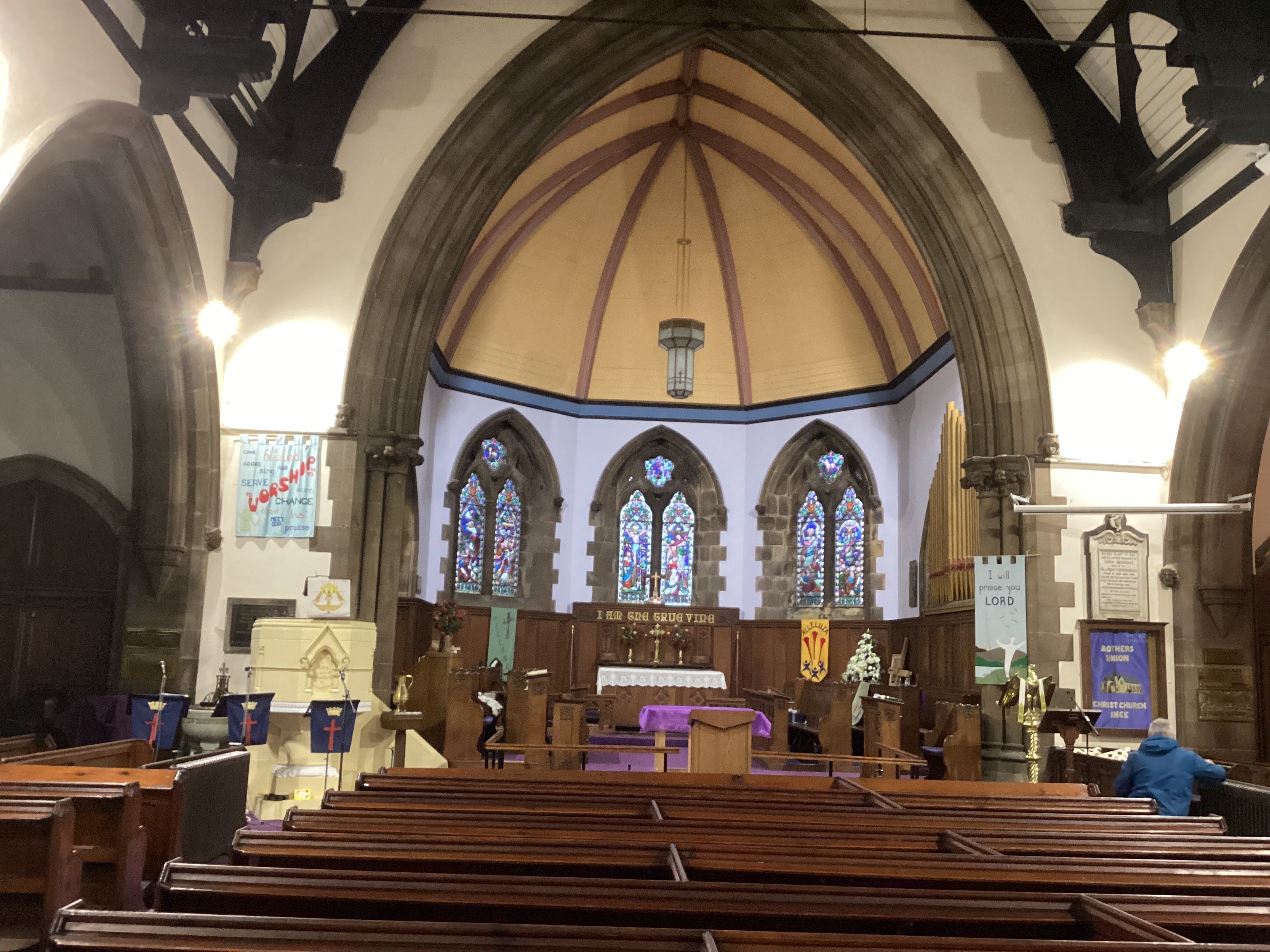 St John's is a beautiful red brick church consecrated in 1899 and containing many stained glass windows and a fine pipe organ built by Thomas Pendlebury of Leigh.