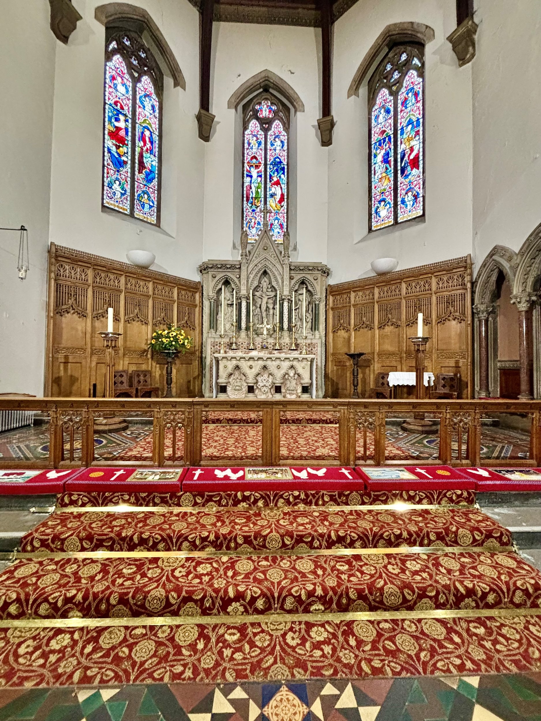 The foundation stone of this, the first new Cathedral to be completed in Great Britain since the Reformation, was laid in 1866 by the Archbishop of Canterbury, and the Cathedral was opened for public worship in 1869. The Cathedral is built of Red Tarradale Stone, with a nave of five bays divided by columns of Peterhead granite. The high altar and reredos are of Caen stone. The panels in the reredos are: the agony in the garden; the crucifixion; and the resurrection. The pulpit is of Caen stone and green marble and rests on short columns of Abriachan granite.