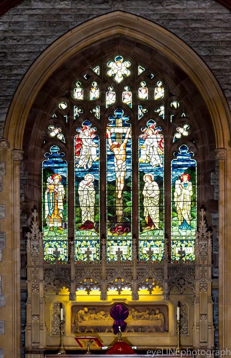 The stained glass windows were designed by the Pre-Raphaelite artist Sir Edward Burne-Jones. The east window depicts the Crucifixion with Jesus occupying the central light (with a unique feature) and Mary and John either side. The upper parts depict angels bearing scrolls with suitable inscriptions. In the side lights are figures of St David with doves of peace on his shoulder on the left and St Elli on the right holding the tower of the church in his arms. The south window illustrates the Nativity and on a scroll across the lower part underneath a group of adoring angels, runs the message “Gogoniant yn y goruchaf i Dduw” (Glory to God in the Highest).