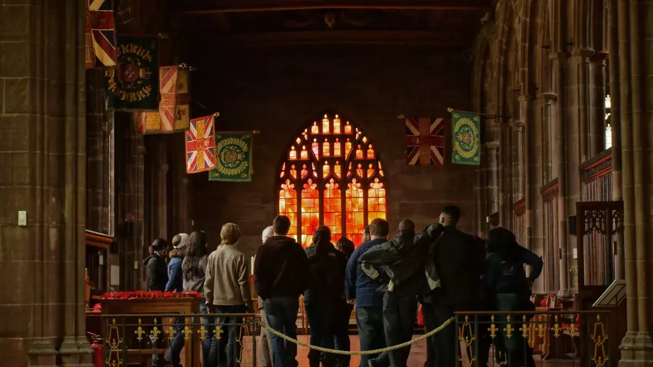 Manchester Cathedral has been centre stage in its city's history for nearly 600 years. In 1421 Henry V signed a royal charter granting permission for a collegiate church to be built. In 1847 a new Manchester diocese was created and this historic church became a Cathedral. This Grade I listed masterpiece has not only provided a stage on which the city of Manchester's compelling history has been played out but also provided some of the leading actors for this narrative. Century after century the stone walls have survived wars and bombings (particularly in 1941), Henry VIII's reformation and Queen Elizabeth I's spy, witnessed the birth of the world anti slavery movement and lived the Industrial Revolution first hand. There are medieval quires and ancient archives, bees on the roof and kangaroos carved on thrones, choristers running to practice and artists drawing in aisles. Classical music concerts served with coffee and wines fairs set to jazz. The misericords are thought to be some of the finest in Europe. Many of them depict a moral, in one of them a woman is scolding a man for breaking a cooking pot, a warning to careless husbands perhaps? In another, men are playing backgammon, no doubt the carvers had heard the medieval priests denouncing the game as the devil's own device for hindering church attendance.