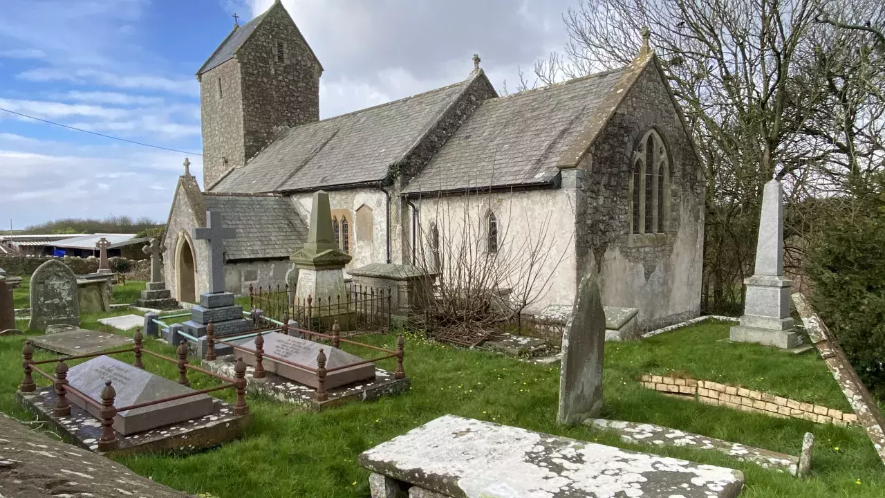 Holy Trinity Church, Marcross, with its characteristic saddleback tower, stands just off the road to the popular Nash Point. The earliest documentary reference is in 1254, but the church was built earlier, probably in the second half of the 12th century. The church consists of Tower, Porch, nave and chancel