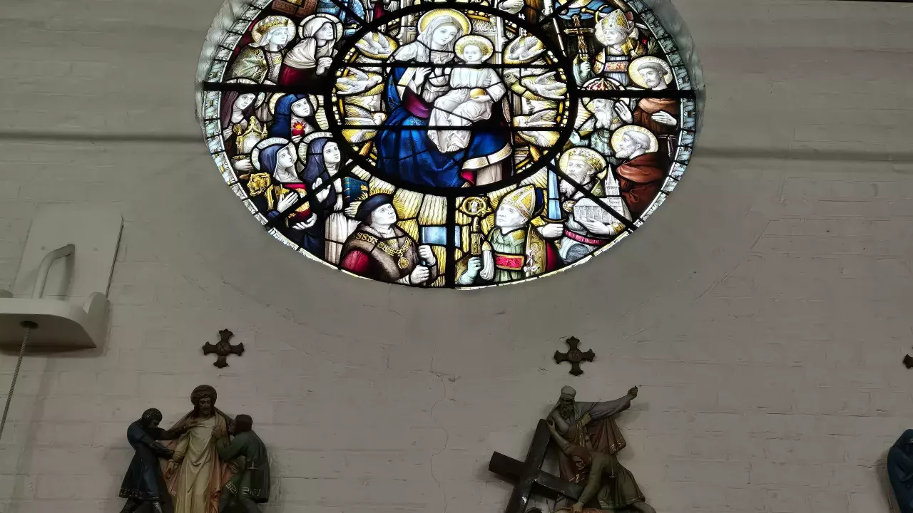 The north wall of the church has a two light shouldered arch window to the north porch and further east a three-light window filled with stained glass by John Hardman. The window is dedicated to the memory of the Revd Thomas Byles, parish priest 1905-12, who died on the S.S. Titanic. It depicts St Patrick, the Good Shepherd and St Thomas Aquinas.