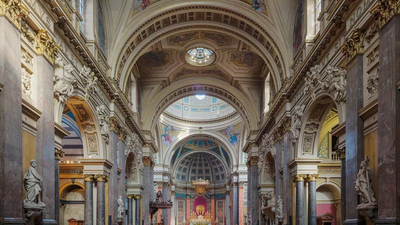 The ornate interior is breathtaking, with a nave wider than St Paul's, pilasters and columns in Devon marble, and more exotic marbles in the apse and altars.