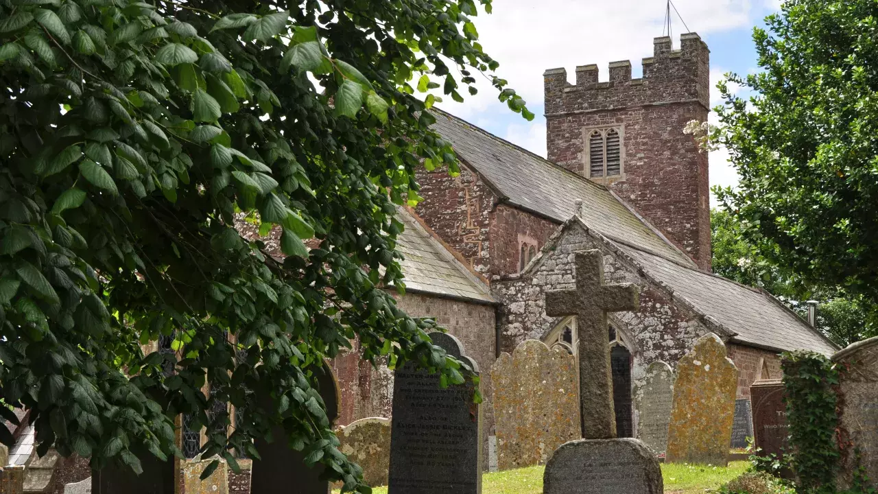 A medieval church with lovely stained glass windows, the churchyard has lovely views over the rolling mid Devon countryside.