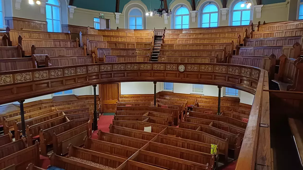 The highlight is the interior. A boarded and panelled ceiling soars over the gallery on Corinthian cast iron columns. The polygonal pulpit is particularly fine.