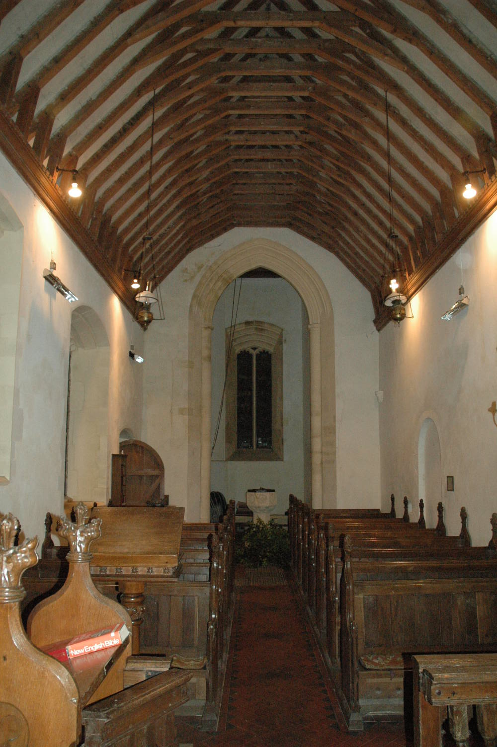 The chancel is late Early English and the east window above the altar has perpendicular tracery. The window itself is of Christ in Majesty and was made in 1890 by Kemp and Co. On the south side is a fine late 13th century arcade of two segmented arches beside which is a pillared squint with a piscina. The Communion rails are believed to be Jacobean as is the simple holy table. The church is fortunate in still having a 16th century hexagonal stone font, decorated with shields in cusped panels. The tower is 16th century. A lofty Gothic arch separates it from the nave. Behind a small padlocked door is a narrow winding stairway leading to the belfry. Four bells are hung in the tower.