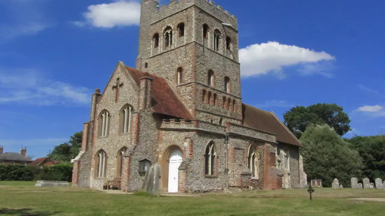 The church is Norman and of great interest with its central tower which was built in 1160. There is a chancel, west gallery over vestry (foreshortened nave) north and south transepts and porches. The tower walls are of reused Roman brick quoins Septaria, iron stone conglomerate and flint, French lime stone and round columns to the belfry windows with modelled faces to the spandrels. The walls of the body of the church are coursed and random split flintwork, lime stone dressings and quoins with dark Roman cement (plastic stone) cappings and string on the north transept.