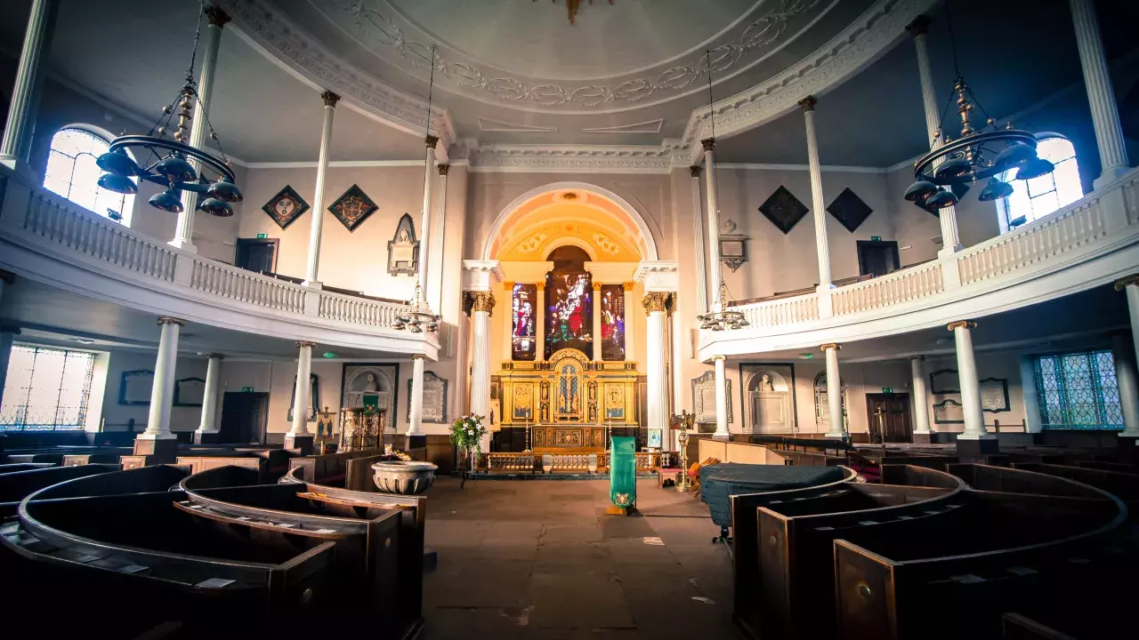 Opinions differ as to how successful a building this is. The tower, from some angles, looks almost unrelated to the rest of the church, being separated from it by a rounded antechamber. But the interior is light, bright and uncluttered. Slender white columns (made of local cast iron) support a gallery that sweeps right round the church.