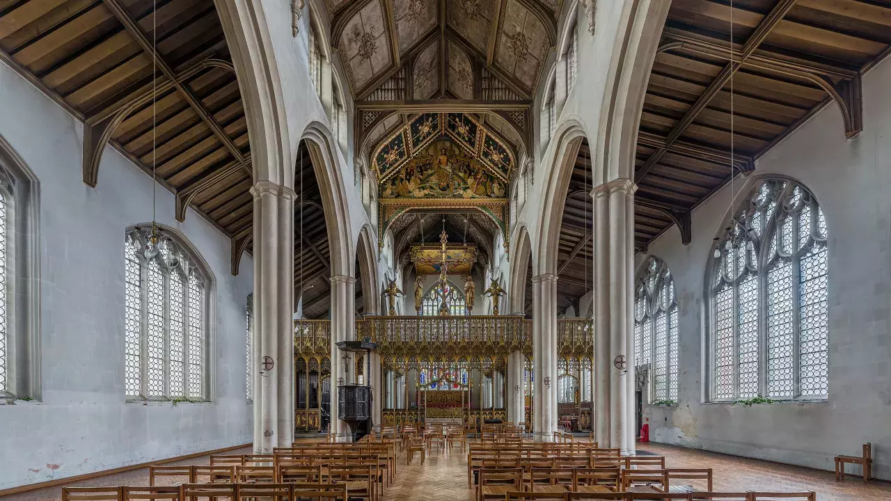 The interior, also in the Perpendicular style, features a white and gold colour scheme with ornate furnishings, including a finely carved and painted rood screen and a gilded classical font cover. The timber hammerbeam roof features tie beam trusses with panelled tracery spandrels. Comper's stated aim was 'to fulfil the ideal of the English Parish Church ... in the last manner of English Architecture'.
