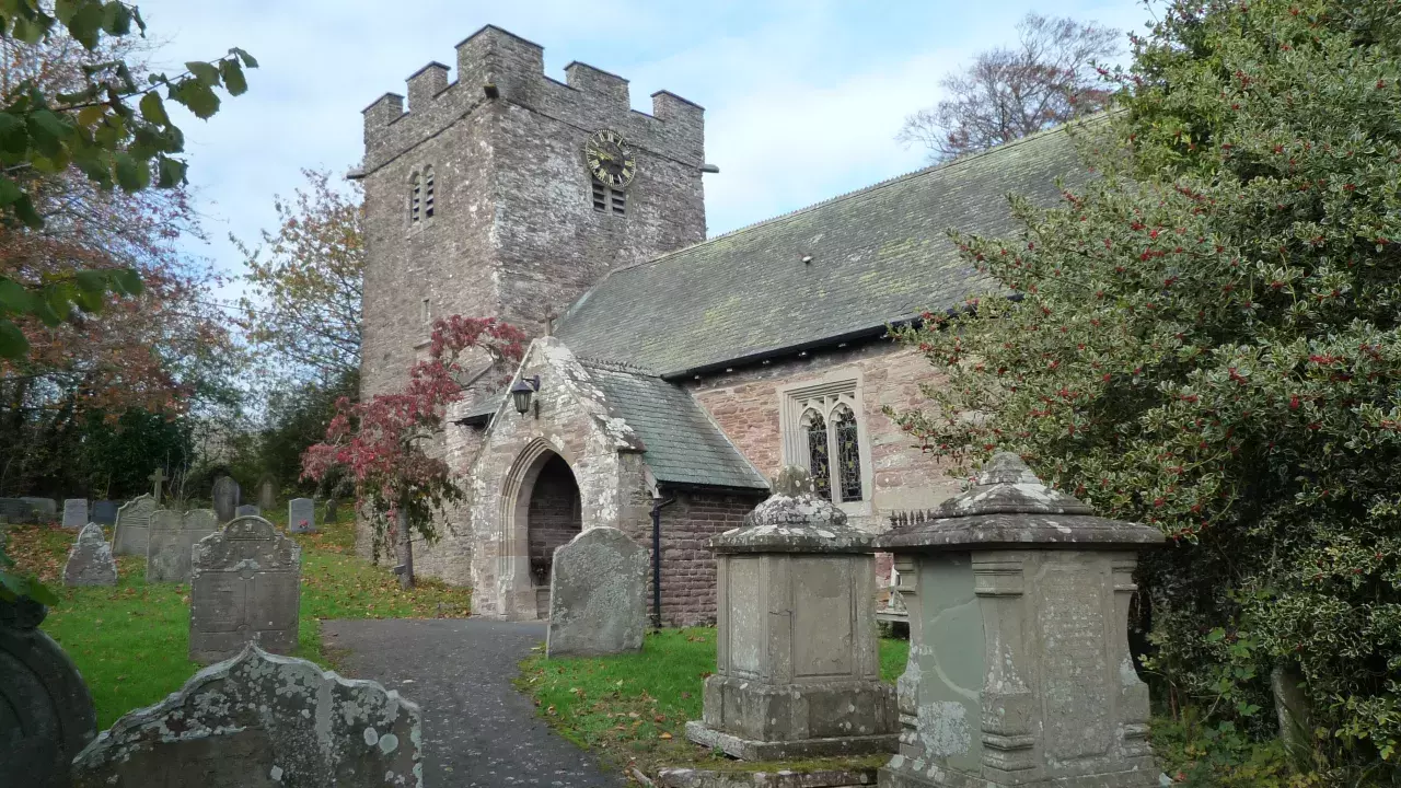 This lovely church of Bacton, overlooking the Golden Valley, is dedicated to Saint Faith. The oldest parts of the present church, dating from the early 13th century, are the west wall and parts of the north and south walls. Although the main roof timbers are late 15th century, several of the small carved angels may be even older. The late 15th century choir stalls, commissioned by Blanche Parry's father or grandfather, have a tiny carving of the Parry coat of arms and were probably designed to match the now lost Rood Screen. Her brother left money in his 1573 Will to repair the tower.