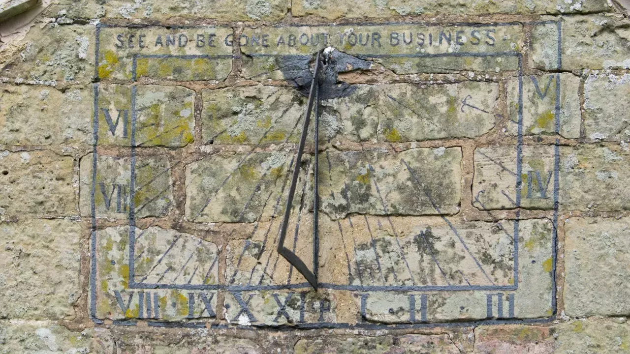 Notice the 18th century painted sundial above the south door, with its motto: 'See and be gone about your business'.
