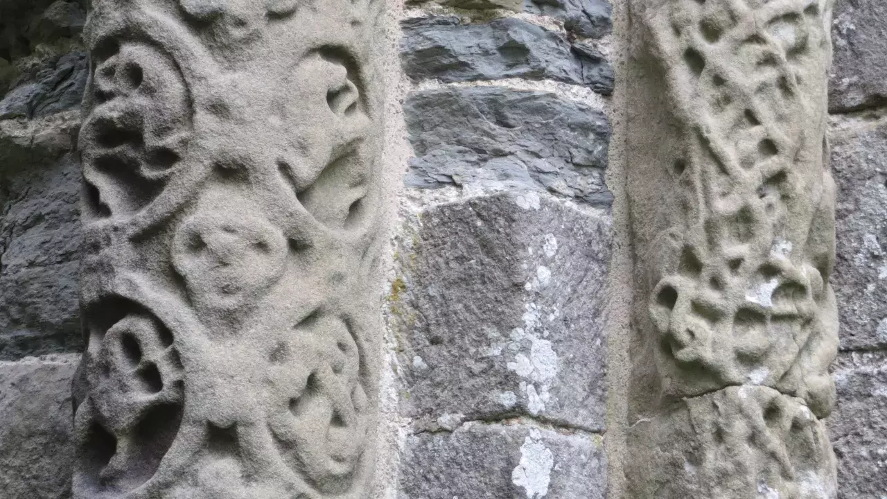 Of the Norman church that stood here before all that remains are the 'Shobdon Arches', reerected fragments of carving put up when the church was being done up in the 18th century. They are very weatherworn now but were once among the best work of their kind by the Herefordshire School of mason/sculptors.