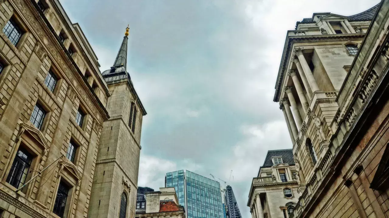 The finely carved font and the reredos in the south chapel (both thought to be by Grinling Gibbons) were brought here from St Olave Jewry. Colourful paintings of Moses and Aaron on either side of the high altar are from St Christopher le Stocks.