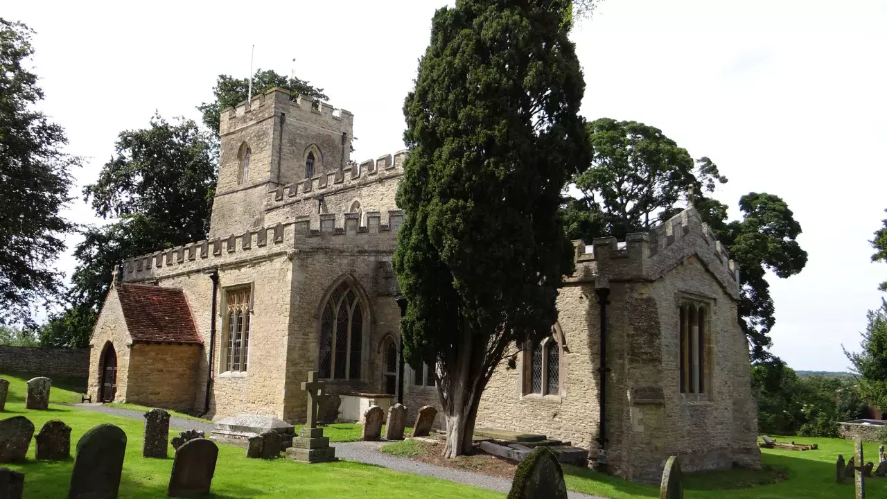 Topped with rows of neat battlements like a church from a medieval fairytale, Clifton Reynes church sits at the end of its secluded village surrounded by open country, in a bend of the River Great Ouse.