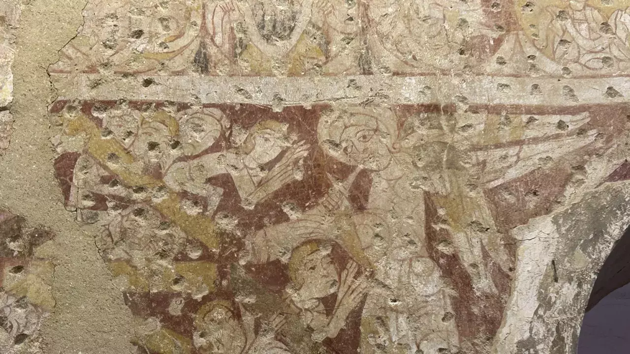 In the course of reroofing it, some plaster was dislodged revealing traces of wall paintings. Further paintings were uncovered and now the east wall of the nave has a substantial amount on display. These paintings have been dated at about 1090, making them some of the oldest in Europe and also one of the most complete sets.