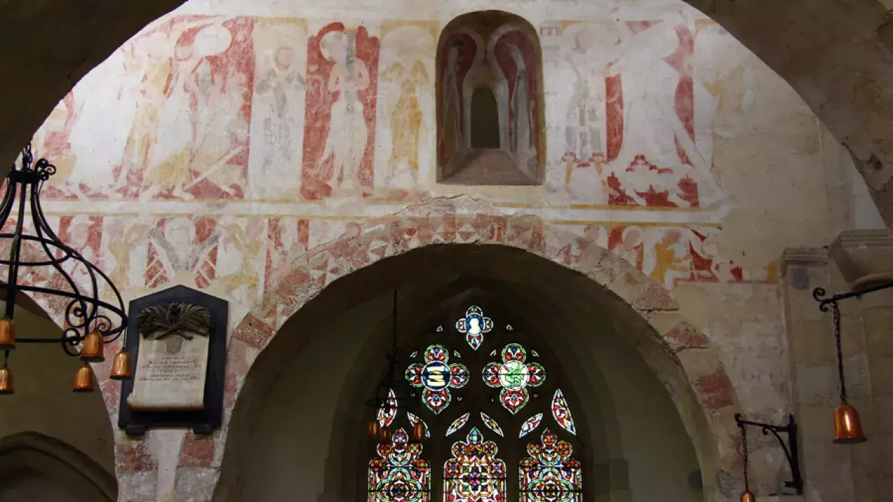 Parts of the church are Norman, as the west doorway shows, but nothing on the outside prepares the visitor for the interior. Ancient round piers support arches above which is a series of very rare late Norman wall paintings.