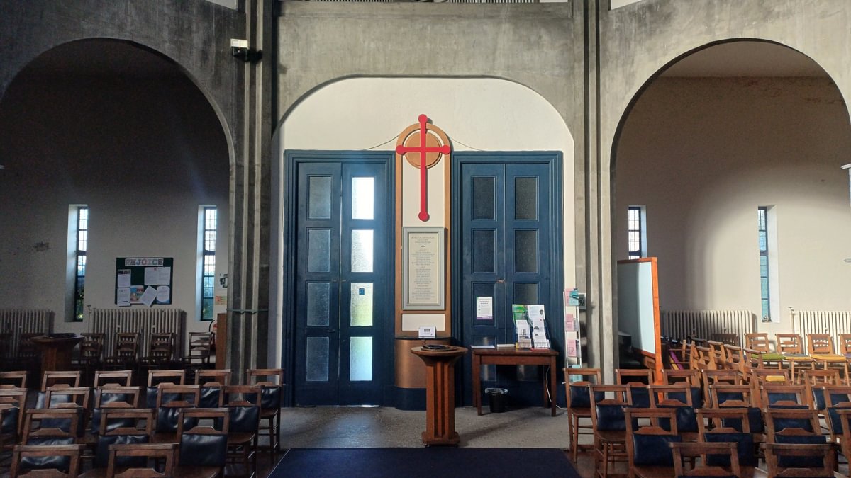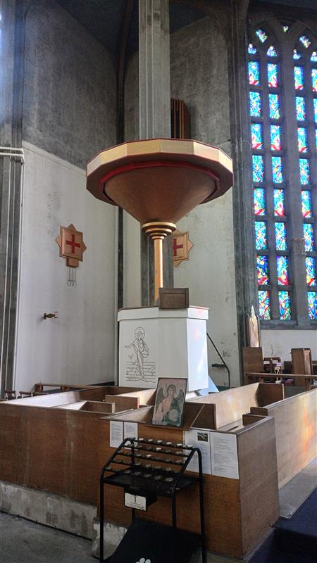 The Art Deco interior, including the stained glass east window, chandelier and massive octagonal font and pulpit, with incised coloured line drawings of St John the Baptist and the sower, make this a stunning 20th century church well worth visiting.