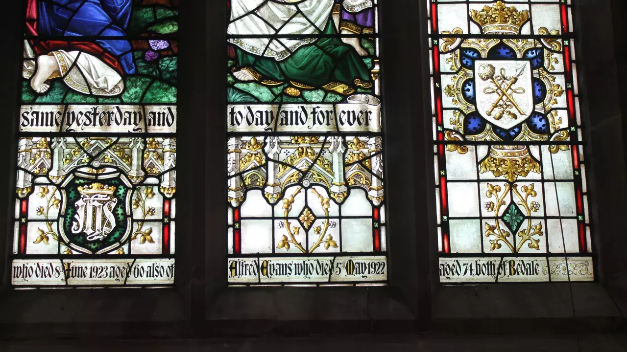 One of the stained glass windows is assembled from fragments of a medieval stained glass window originally in the north nave. In the west wall there is the Eisteddfod Window, dedicated in 1959, which depicts King Henry VIII granting bards a charter for the pioneering eisteddfod held in Caerwys in 1523 The decorative oak altar screen was given by the Revd J Sinnett Jones in memory of his two sons and son in law, all killed in the First World War. There are memorials to the Caerwys fallen of two World Wars.