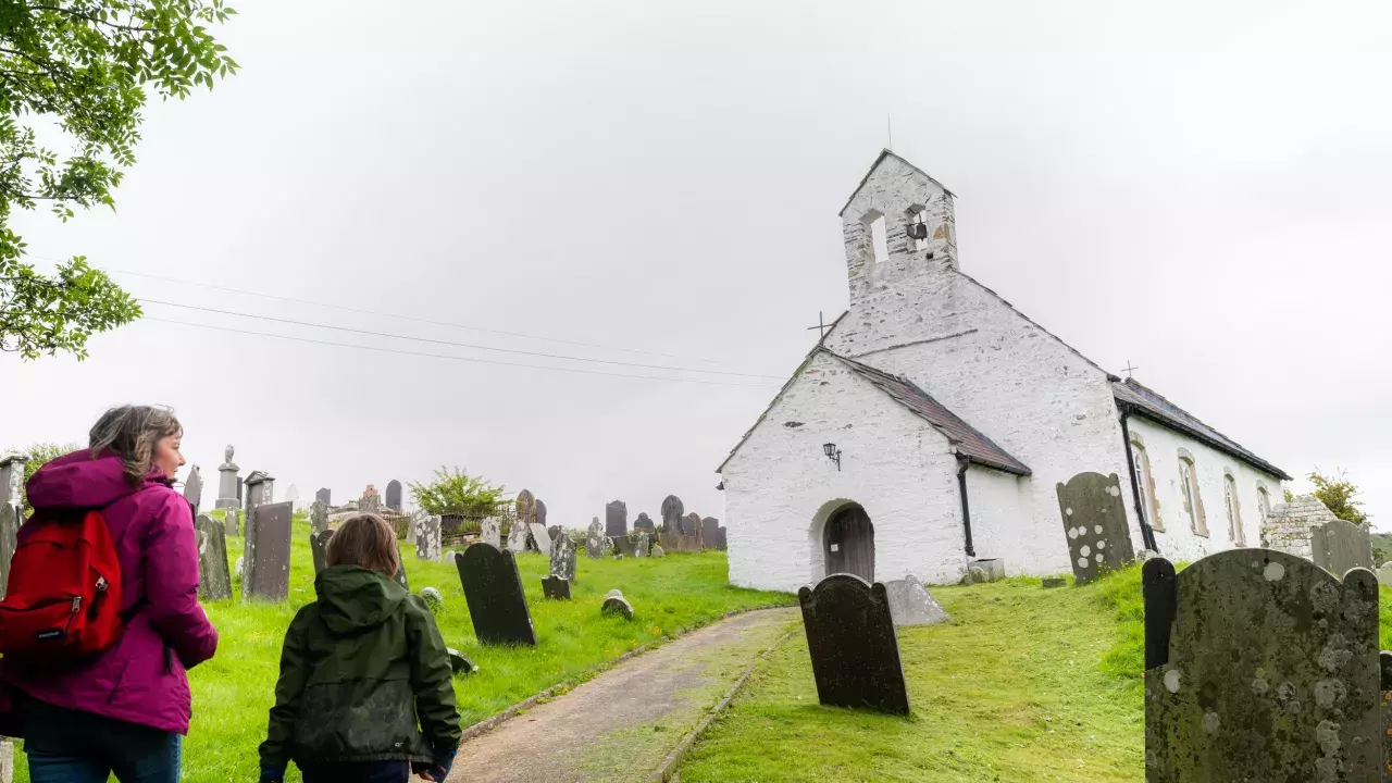 The church stands above the settlement and beach of Penbryn a popular, National Trust owned, stretch of the coast.