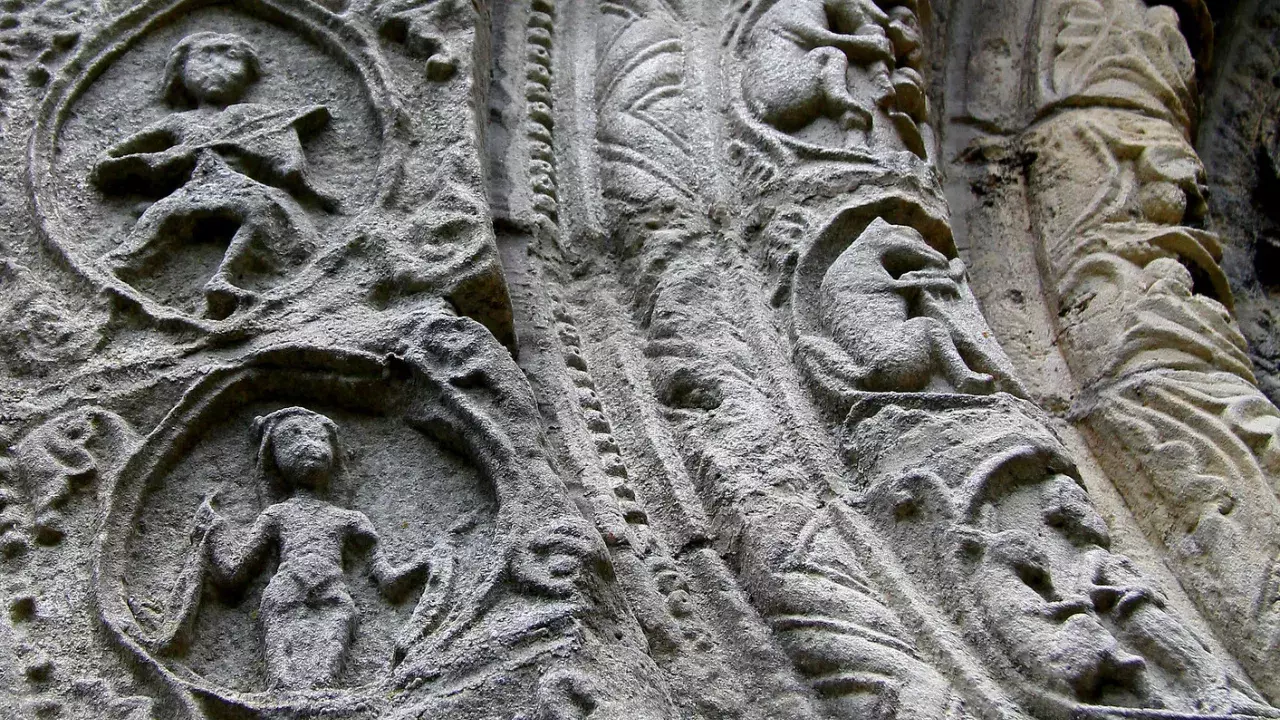 The east end of church has a magnificent and very unusual wheel window above arcading and corbels, with niches on either side of window, in one of which is a mounted rider. The wheel window itself is surrounded by complex carving, and the spokes of the wheel are being swallowed by faces with huge teeth, bulging eyes and foliage for hair.