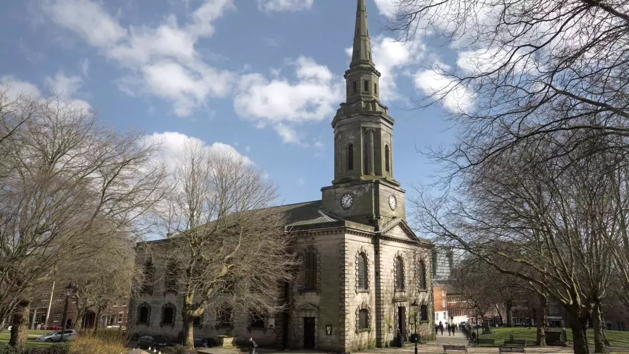 Built between 1777 and 1779 as a chapel of ease of St Martin in the Bullring, it is the only survivor of the town’s 18th century churches and stands in the city’s only surviving Georgian square. It is a neo classical building with a rectangular nave with aisles and galleries. The design is clearly influenced by St Martin in the Fields, though without the portico.