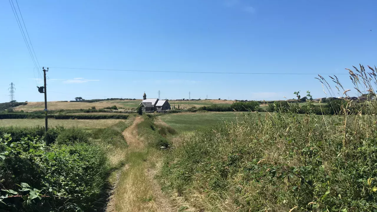 St Peulan is medieval in origin, and stands in isolation at the end of its raised, grassed, causeway, which turns off the road signposted to Dolbaen.