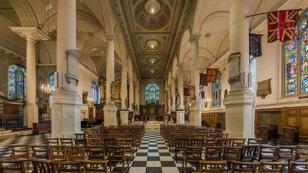 It is the largest parish church in the City, a wide, roomy space with a coffered ceiling.