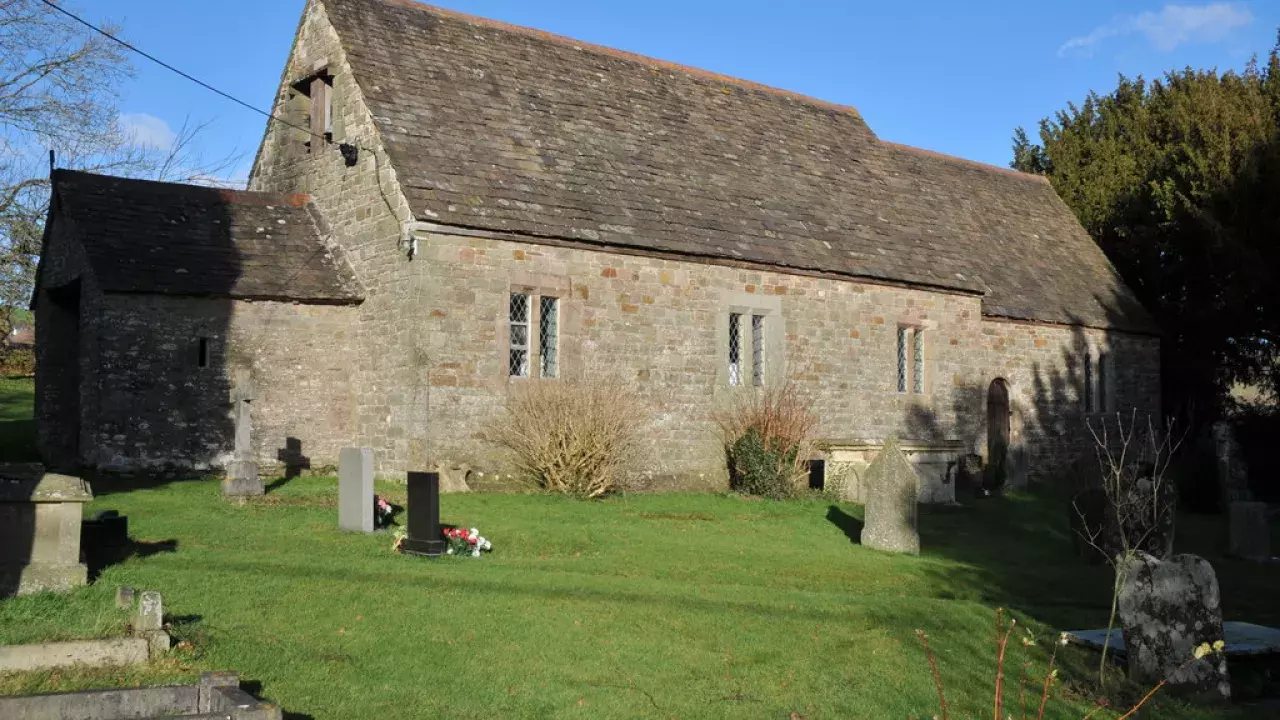 The church still has its box pews and some endearing wall monuments with flowers and cherubs. Round the chancel arch is a nineteenth-century inscription recording gifts to the parish and its poor. Outside, hanging under the eaves, is the bier on which the dead of the parish were carried to their graves. This little church has so many memories of the community it served.