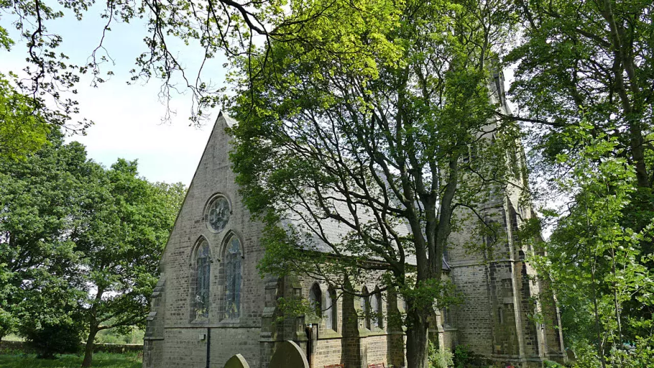 It is situated in a quiet hilltop village above Holmfirth in West Yorkshire. It is grade II listed, completed in 1870 and was designed by Mallinson & Barber featuring an arch based hammer beam roof structure and encaustic tiles designed personally by William Swindon Barber.