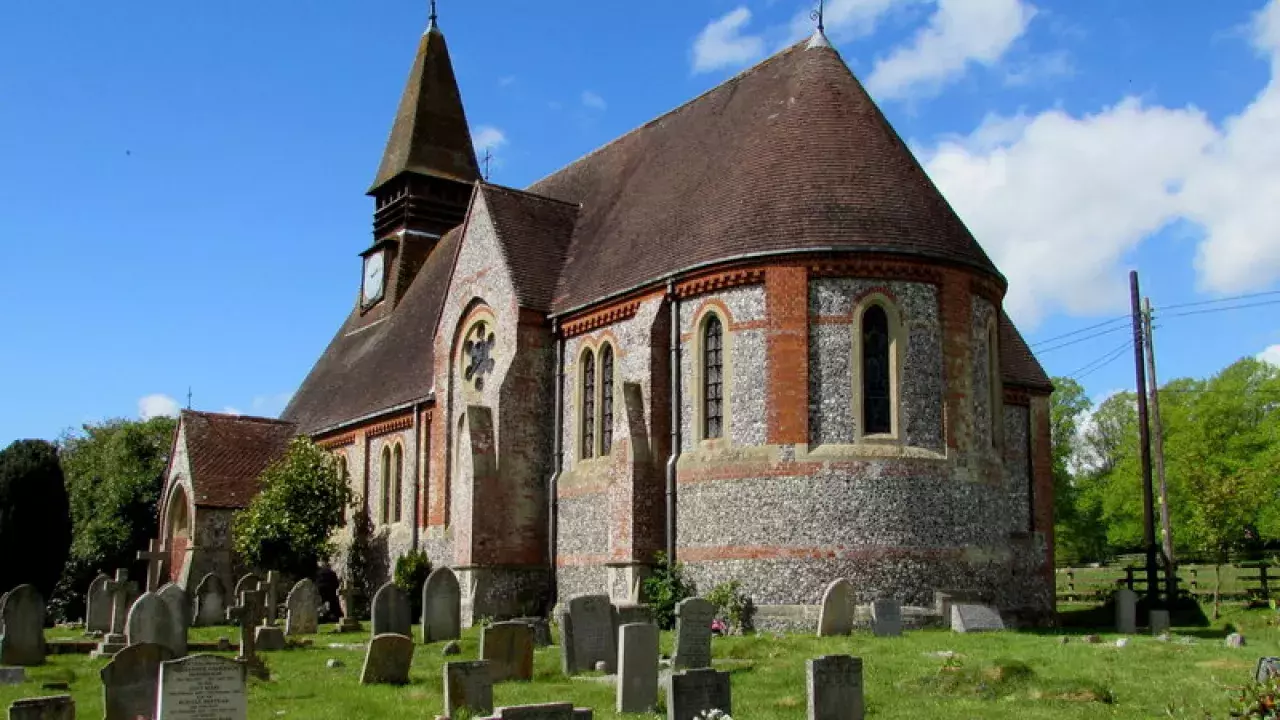 The benefactors were Thomas Baring whose family plot is in the churchyard and the Revd George Glossop who had been the previous rector of the church. The church is the Early English style constructed of flint, stone and brick with a semi circular apse. Stained glass windows by William Morris were added in 1916-7. Some features from the old church were incorporated in the new building including some medieval tiles and the Norman font basin which was re-erected on a pedestal of Caen stone. The three bells were also taken from the old church and re-hung in the new bell tower.