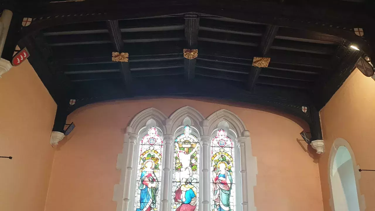The nave is entered by the south door, which is covered by a simple porch. To the left of the door is the plain, octagonal 15th Century font, above which hangs a print of Holman Hunt's 'The Light of The World'. On the west wall is a small part of a wall painting, believed to have been salvaged from the previous building, and on the north wall hangs a list of rectors. The church has a reredos by William Butterfield (gifted by All Saints Margaret Street) and there is a late medieval timber chancel ceiling (possibly from Prittlewell Priory).