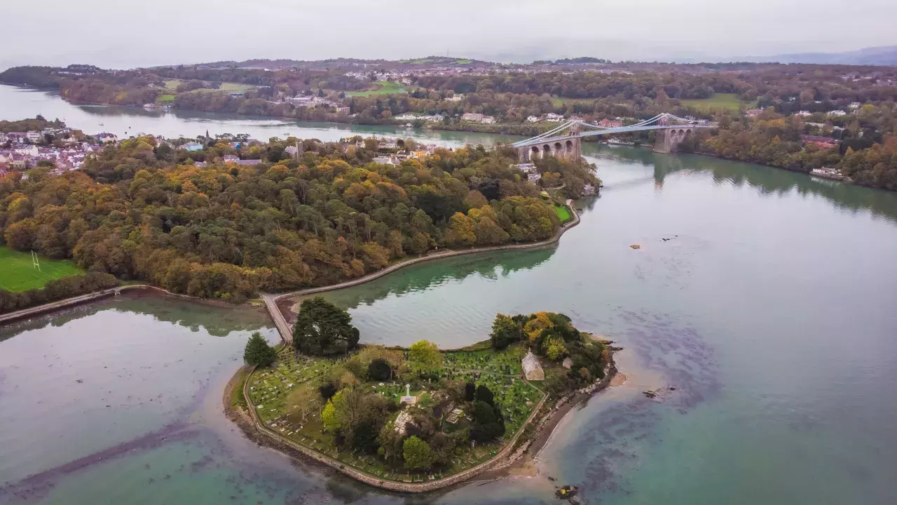 Ar gopa’r ynys, mae cofeb i’r gwŷr lleol a fu farw yn ystod y rhyfeloedd byd. Dyma’r lle gorau i edrych ar Afon Menai a’r ddwy bont sy’n ei chroesi.