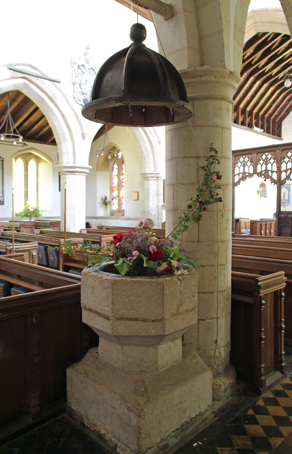 Inside, there are remains of medieval wall paintings showing scenes from the life of St Margaret, a 16th century font cover and a medieval screen and benches, one of which has a renowned carving of a tiger on it.