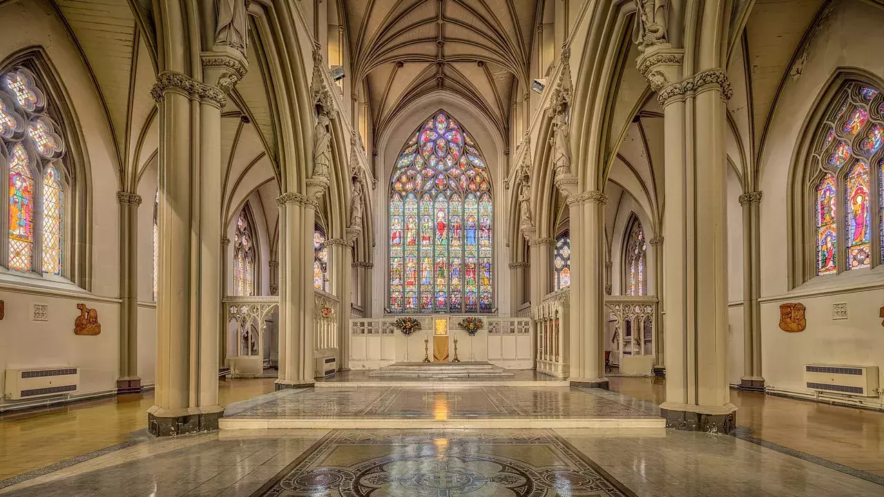 The foundation stone was laid on Whit Thursday, May 1844, by Bishop James Sharples. The architect was Matthew Ellison Hadfield of Sheffield, and Salford Cathedral is the largest and most significant of his works, being the first Catholic Church to be built in cruciform shape since the Reformation and the Cathedral. Hadfield also designed other churches in the Diocese, including St Joseph, Stockport and St Mary, Burnley, as well as redesigning St Mary in Manchester city centre. Its design was inspired by churches from around England and the continent. For the west front and nave, Hadfield looked to Howden church, Yorkshire. The choir and sanctuary are influenced by the Benedictine Abbey of Selby from across the Pennines. For the spire, still the tallest on the Manchester skyline, he emulated the 15th century church of St Mary Magdalene in Newark on Trent and his design for the roof was inspired by that of the St James at Liege, Belgium. It was opened on 9th August 1848, by Bishop George Brown. In 1852, after the Restoration of the Catholic Hierarchy, it was raised to the dignity of a cathedral.