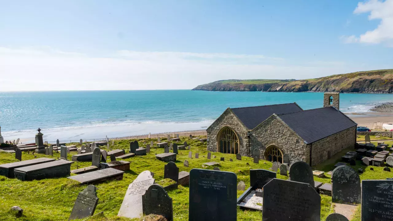 This medieval pilgrim church stands above the shore of the Irish Sea, at the end of the Llyn Peninsula, nestled in the old fishing village of Aberdaron.