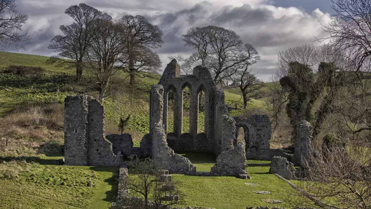 Before the Abbey was built there, there was a pre-Norman church called Inis Cumhscraigh on the site, which was plundered by Vikings in 1002. Its large earthworks, which can clearly been seen from the air, still survive in parts.