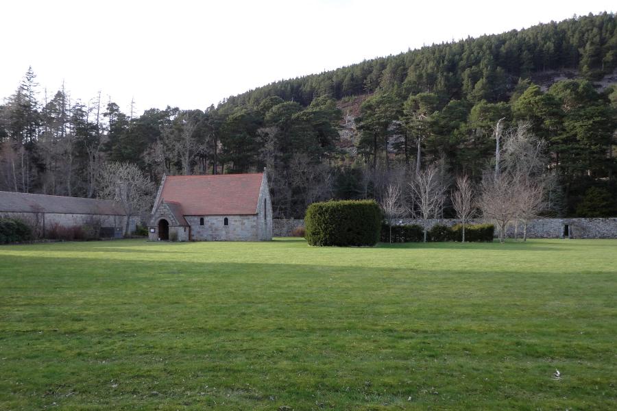 Crathie Church overlooks the River Dee and the ruins of an earlier 14th century church.