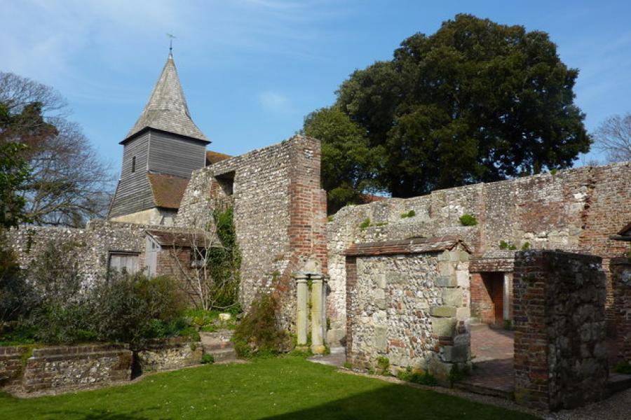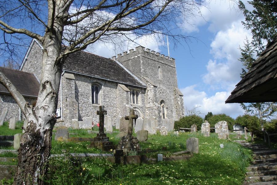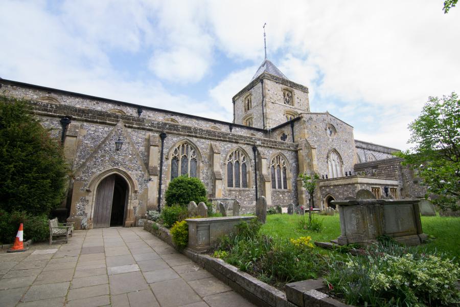 It stands beside the Tye, a large green that may have served as a market in medieval times. In 1399 the church was granted to Michelham Priory. The church is built on a small mound, surrounded by a flint wall, suggesting that the site was a sacred place in the pre Christian period. The sheer scale of the church has led to its moniker 'The Cathedral of the Downs'. The church seems to have been built in one go, also unusual, at a time when most churches evolved slowly over centuries.