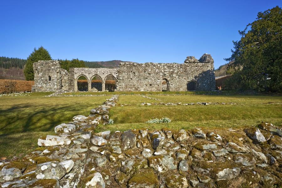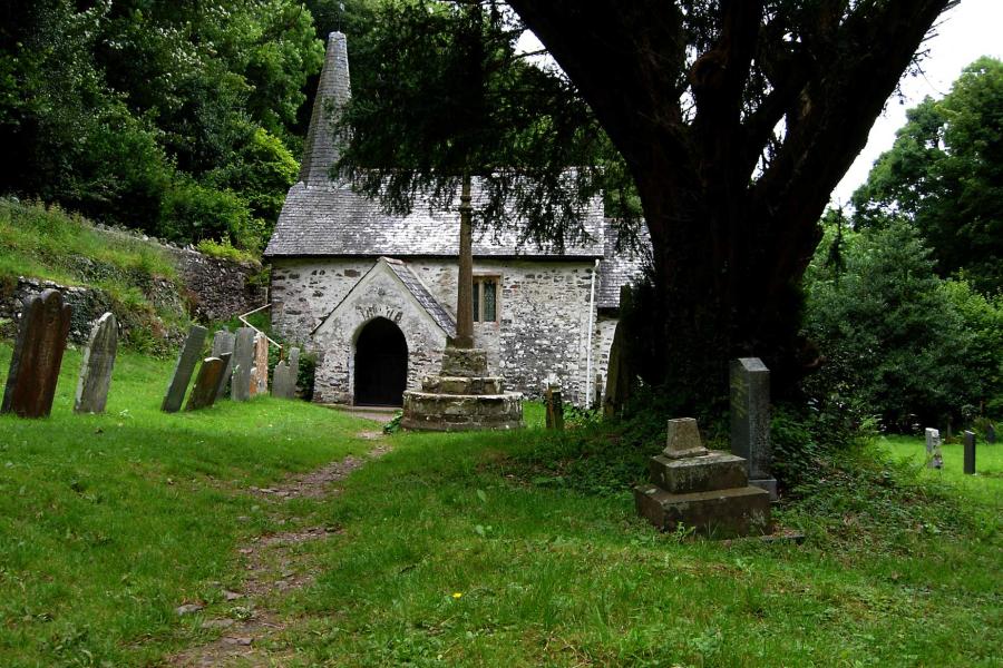 Reached along tiny, winding flower filled lanes (or by footpath), the medieval pilgrim church of St Issui, Patricio sits on a south facing slope looking over a tiny valley to the slopes of the Sugar Loaf mountain. In the 6th century an early Christian hermit named Issui, or Ishow, founded a cell here on a sloping hillside beside a stream. The stream fed a well from which the hermit drew water. You can still see the well, just a short walk downhill from the churchyard and easy to spot, with strips of colourful cloth tied to branches of nearby trees.