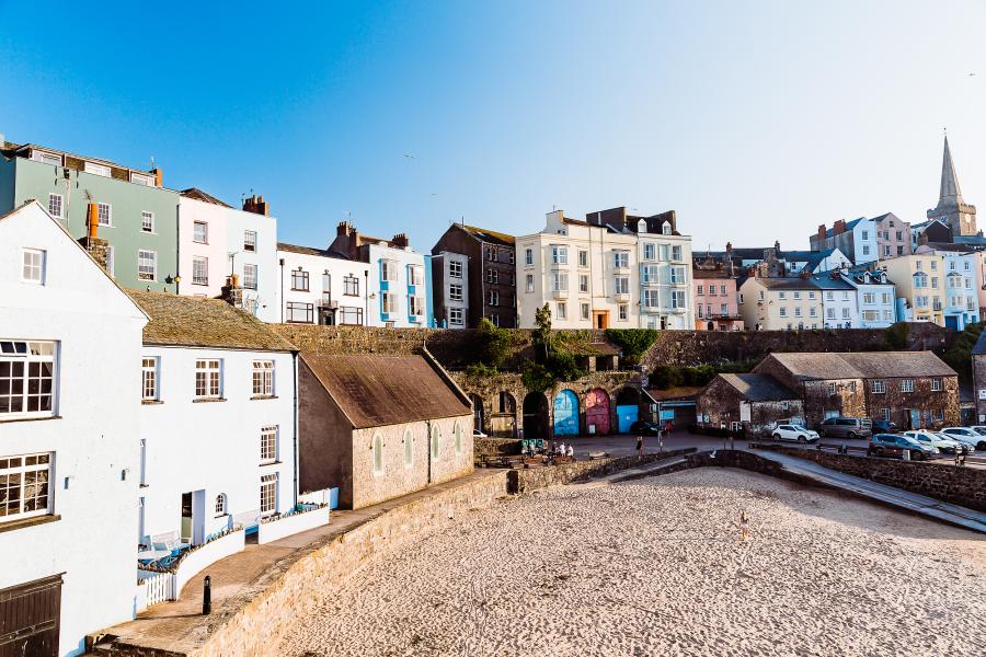 Rows of pretty town houses in pinks, blues, greens and creams line the harbourside. Above them all rises the spire of St Mary, Temby. Here is a memorial to mathematician Robert Recorde who died in 1510 and who is famous for having invented the equals (=) sign!